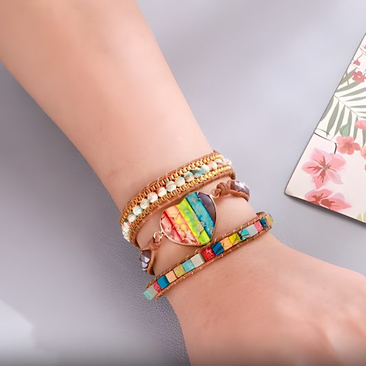 Pulsera de Cuero con Corazón y Piedras Multicolores
